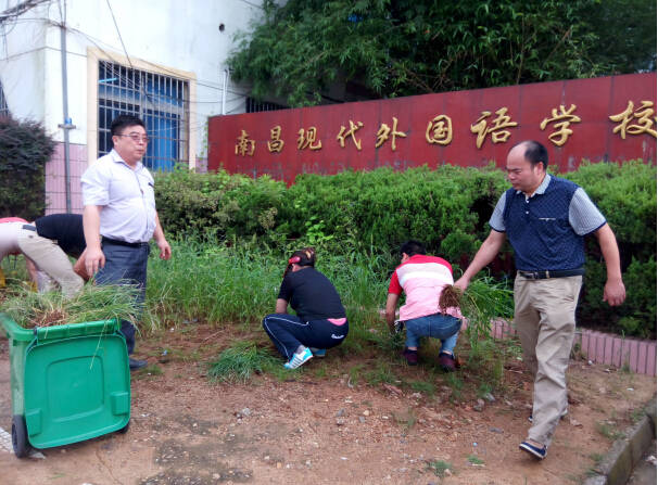 校園環(huán)境的好壞是家長對學(xué)校認(rèn)識的第一印象。校辦公室在努力做好招聘老師、協(xié)助招生工作的同時,積極做好校園衛(wèi)生工作。為提升學(xué)校的整體形象,楊校長還親自帶領(lǐng)行政處室人員頂著烈日,將校園內(nèi)外的雜草拔除干凈,同時各學(xué)部校長也積極督促清潔工人,將本學(xué)部衛(wèi)生包干區(qū)打掃干凈。