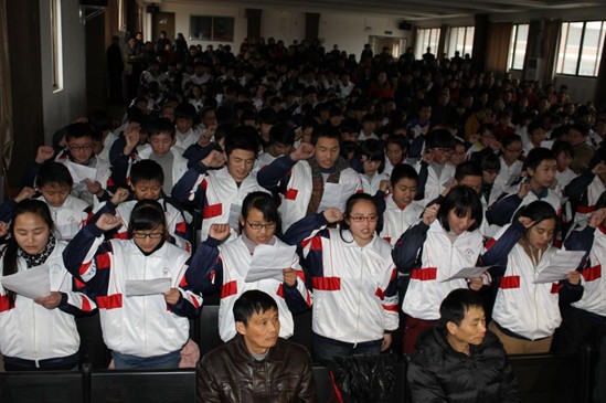 最后,師生們共同宣誓。全體初三年級(jí)組班主任和任課教師承諾,始終跟同學(xué)們?cè)谕粋€(gè)“戰(zhàn)壕”,始終充滿激情,和同學(xué)們朝夕相處,同甘共苦,同舟共濟(jì),竭盡全力,誓為同學(xué)們搖旗吶喊,誓為同學(xué)們保駕護(hù)航。無論成功與否,將是每一位同學(xué)的堅(jiān)強(qiáng)后盾。在各班班長(zhǎng)帶領(lǐng)下,該校初三學(xué)生也分別宣誓。師生們的誓言鏗鏘有力,響徹整個(gè)會(huì)場(chǎng),充滿激情,銳不可當(dāng)。他們信心百倍,誓獲2014年中考全勝!
