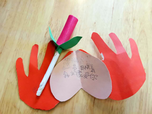 看!孩子們用自己的小手為媽媽做得禮物,玫瑰花雖然不是真的,但是,是孩子們親手制作的。小小的手上的愛心卡片寫滿了孩子們對他*的愛。