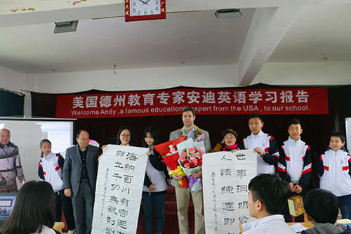 課上,安迪老師以生動豐富的授課內(nèi)容、風趣幽默的授課方式,主要圍繞激發(fā)學習英語興趣、了解中美文化差異、介紹美國校園生活文化、如何用積極心態(tài)在校園與人相處等幾個方面,讓學生們在獲得知識的同時,也體會到了美國的風土人情,了解了更多的美國學校園文化。課堂上,學生們更是紛紛舉手、踴躍提問,一個個關于學習英語的問題得到安迪老師的認真回答,學生們表示受益匪淺。課后,學生代表們還向安迪老師獻上鮮花和花環(huán),爭先恐后地找安迪老師簽名,并依依不舍地合影留念。