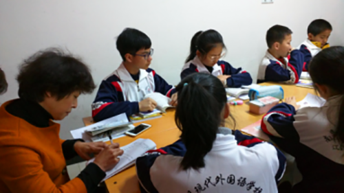 張水秀校長在聽語文課,認(rèn)真做筆記。