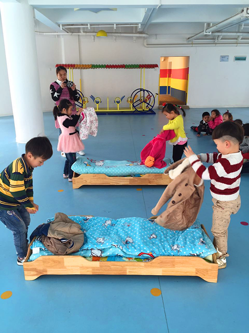 3、大班“疊被子”,幼兒將誰亂的被子折疊擺放整齊。