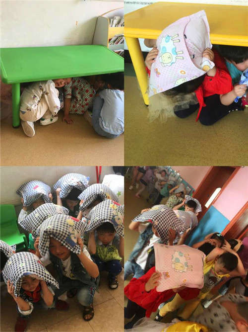 上午10點10分防震演習(xí)正式開始,當(dāng)?shù)谝宦暰瘓箜懫饡r,教師立馬提醒小朋友不要慌張,教大家立刻鉆到桌子下面、角落里,并把枕頭頂在頭上。在警報解除后,小朋友在教師沉著冷靜地指揮下,從教室門迅速有序的撤離,并到安全地帶集合。