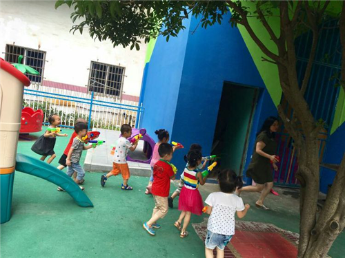 活動(dòng)中,每個(gè)孩子做了充分準(zhǔn)備,有雨衣、雨靴、備用衣物,最吸引眼球的還屬威力不同的水槍裝備,有大小不同的水槍、各種卡通造型的水槍、“噴霧器式”水槍等。在活動(dòng)中,有的班級(jí)的孩子打起了“保衛(wèi)戰(zhàn)”,“開戰(zhàn)!”老師一聲令下,孩子們互相噴射起來,個(gè)個(gè)都神勇無比,不甘示弱。孩子們充分體驗(yàn)了玩水槍的快樂,此時(shí),幼兒園變成了歡樂的海洋。在水槍大戰(zhàn)中老師加入到孩子們的隊(duì)伍中,像做戰(zhàn)指揮官一樣率領(lǐng)著小朋友們盡情地開展玩水游戲,尖叫聲、歡笑聲、吶喊聲,此起彼伏,幼兒園頓時(shí)沸騰起來,變成了一片歡樂的海洋。