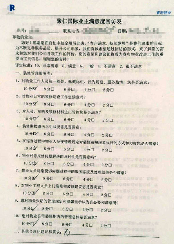 近日,睿府物業(yè)品質(zhì)部采取走訪、發(fā)放調(diào)查問卷、電話等方式,對6號樓裝修期業(yè)主進行回訪,對業(yè)主裝修期間提出的每一個意見做出反饋,切實解決各類突出問題。