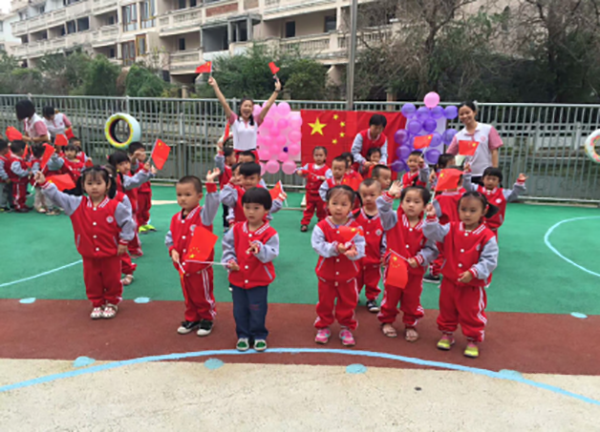 首先,活動的第一個環(huán)節(jié)——升國旗奏國歌,音樂響起時四名護旗手一只手護著國旗一手敬禮向升旗臺緩緩走來,當國歌響起,迪斯尼象湖園全體師生齊唱國歌行注目禮,目送國旗冉冉升起!音樂停止,禮畢!