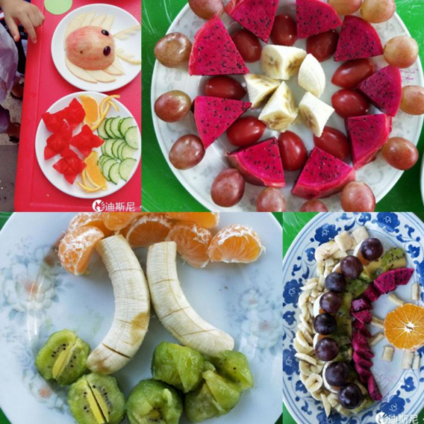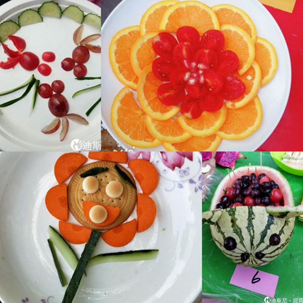 在親子活動(dòng)結(jié)束后,家長(zhǎng)和孩子們開始將帶來的水果以及事物進(jìn)行腦洞大開的創(chuàng)意DIY啦!各式各樣的水果色彩繽紛,在大家的共同努力下,形態(tài)各異的創(chuàng)意水果拼盤呈現(xiàn)在大家眼前,有黃瓜擺成竹子造型的“步步高升”,餅干、胡蘿卜、黃瓜拼成的“向日葵”,圣女果做的“小金魚”……