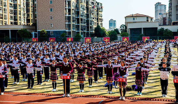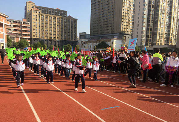 在激昂的《運(yùn)動(dòng)員進(jìn)行曲》音樂聲中,隆重而熱烈的開幕儀式拉開帷幕。青春的腳步,快如金秋之風(fēng);綻放的笑容,燦若春曉之花。國(guó)旗隊(duì)、會(huì)徽隊(duì)、彩旗隊(duì)、鼓號(hào)隊(duì)首先入場(chǎng),場(chǎng)面壯觀,氣勢(shì)恢宏。在儀仗隊(duì)的引領(lǐng)下,70個(gè)班運(yùn)動(dòng)員方陣昂首步入會(huì)場(chǎng),嘹亮的口號(hào)彰顯出同學(xué)們飽滿的狀態(tài)和高昂的斗志。新穎出彩的口號(hào)標(biāo)語(yǔ)、創(chuàng)意十足的才藝展示、精致巧思的造型道具……無(wú)不透露著現(xiàn)外學(xué)子意氣風(fēng)發(fā)、昂揚(yáng)向上的良好精神風(fēng)貌。接著,進(jìn)行3—8年級(jí)學(xué)生廣播體操比賽,隨著悠揚(yáng)的音樂響起,同學(xué)們神采飛揚(yáng),一雙雙小手在空中劃出優(yōu)美的弧度,一張張笑臉洋溢著濃濃的青春活力,展現(xiàn)了學(xué)生陽(yáng)光可愛,健康向上的精神面貌。