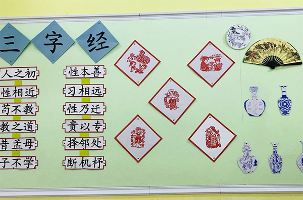 學(xué)期前,江西迪斯尼幼兒園·金沙園就以中國傳統(tǒng)文化作為環(huán)境創(chuàng)設(shè)的主題,比如我園樓道墻體懸掛或張貼了各式各樣的戲曲臉譜、文化扇、剪紙、國畫等;樓道吊飾則裝飾成了中華瓷器的造型,小主題命名為《中華瓷韻》;展覽架一般做成博古架的造型,擺放一些以石頭、瓶子、粘土為載體的中國元素的裝飾。吊飾以中國戲曲,中國瓷藝,中國剪紙,中國扇藝,十二生肖,四大發(fā)明,二十四節(jié)氣,二十四孝、成語故事繪圖等作為題材。這些裝飾首先從視覺上給人以濃重的中國味,使幼兒置身于中國元素的氛圍中,潛移默化的體驗中華文化的豐厚與博大,感受中華文明的大氣與典雅。
