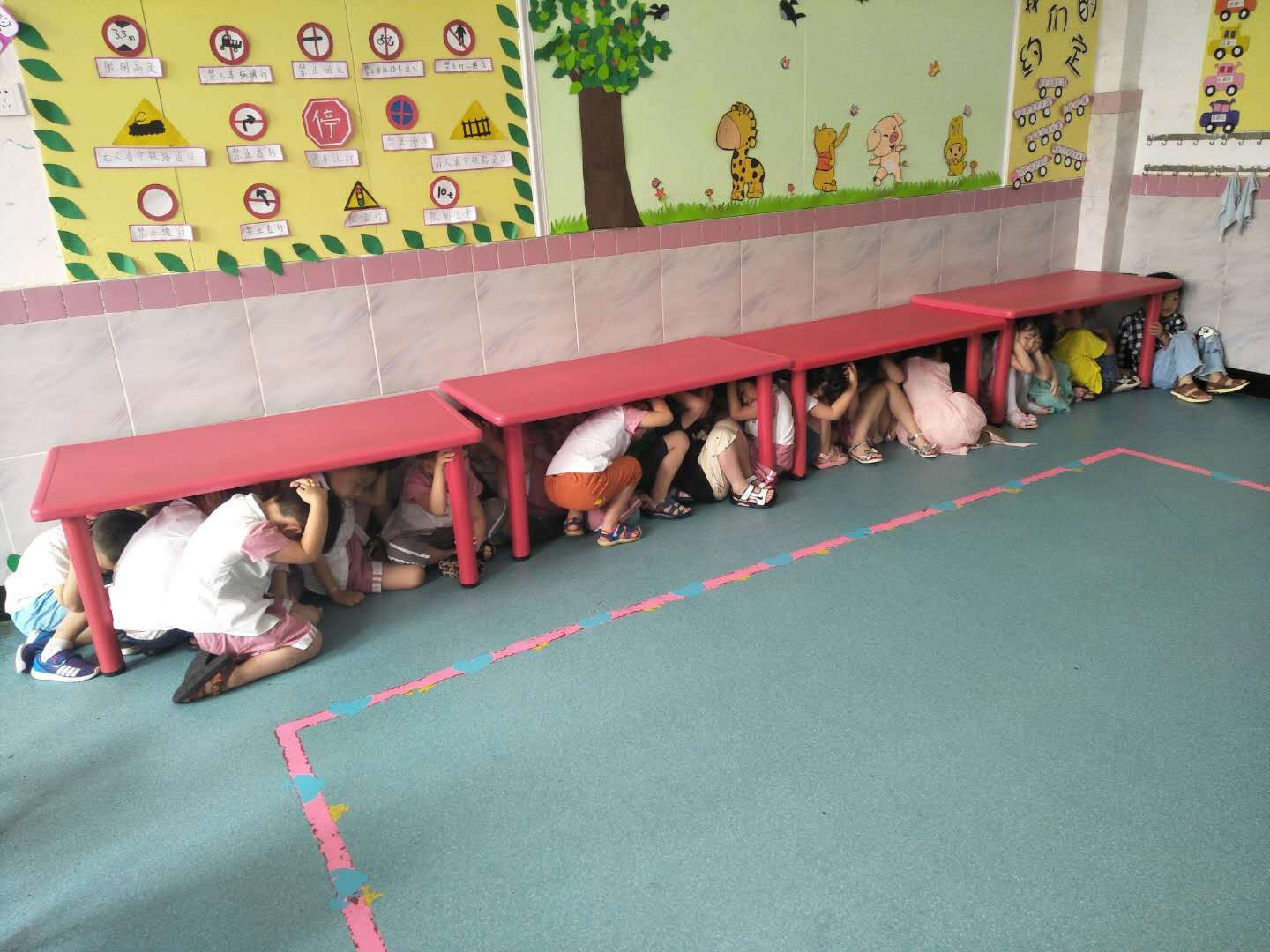 一分鐘后,信號(hào)員解除警報(bào),各班教師組織幼兒用手或其他物品保護(hù)頭部,迅速有序地分別從各個(gè)安全通道緊急疏散到室外安全空曠的場(chǎng)地(一樓操場(chǎng))。