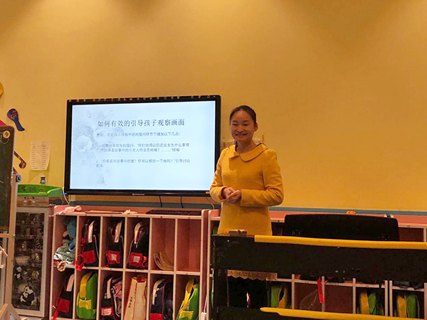 在此次培訓(xùn)中刑老師通過示范講解、有趣的互動(dòng)游戲,及時(shí)巧妙的提問題,對(duì)各年齡段的抽象的數(shù)學(xué)概念、高深的數(shù)學(xué)思想進(jìn)行系統(tǒng)闡述,指導(dǎo)如何理解使用教具的教學(xué)功能及教學(xué)中的實(shí)施方法。通過簡(jiǎn)單有趣的教具,形成了形象生動(dòng)的直觀思維,體驗(yàn)到學(xué)數(shù)學(xué)的快樂有趣。同時(shí),運(yùn)用多媒體課件幫助老師們直觀地理解抽象的理論,利用豐富多彩的電子稿課件講解了繪本教學(xué)的內(nèi)容,對(duì)老師怎樣和孩子讀書做了引導(dǎo)和示范。
