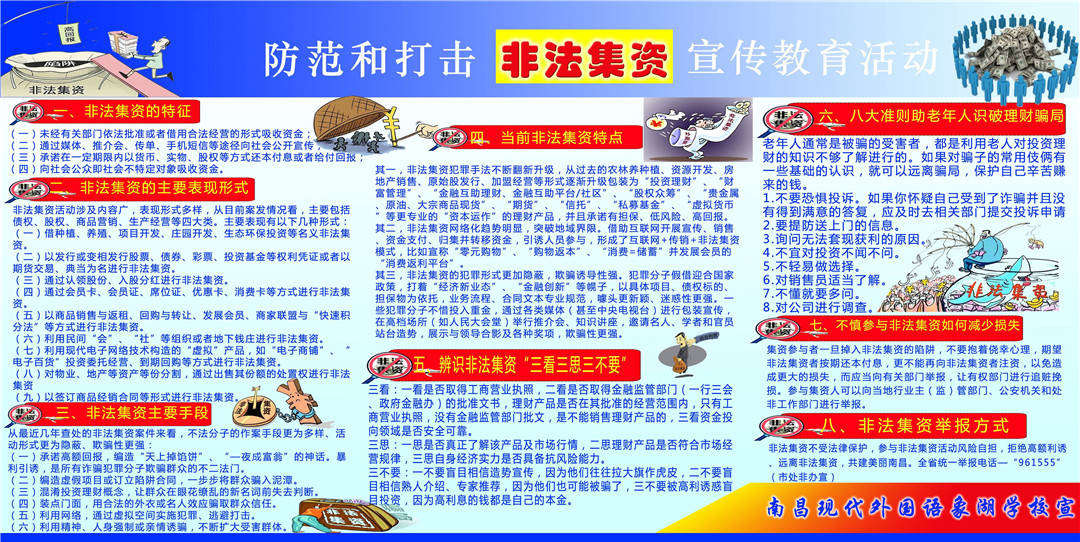 根據《南昌市2018年防范和打擊非法集資宣傳月活動實施方案》要求,以保護人民群眾切身利益、維護社會穩(wěn)定為出發(fā)點,提高社會公眾對非法集資的識別能力,教育人民群眾增強風險防范意識,培養(yǎng)正確的投資理念,營造防范打擊非法集資的良好輿論氛圍,震懾犯罪分子,并以此擴大宣傳教育覆蓋面,增強宣傳效果,我校特開展防范和打擊非法集資宣傳教育進校園活動。