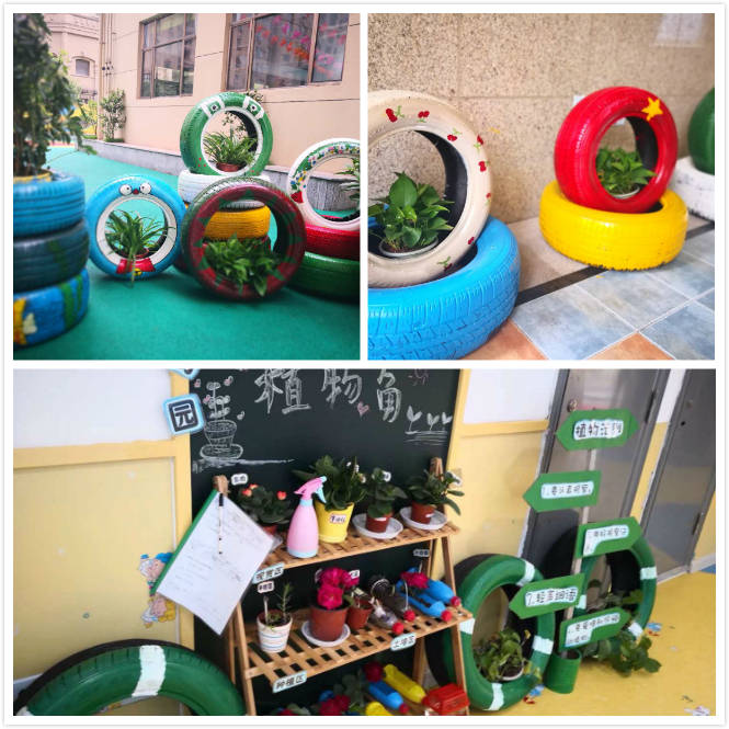 園所里準(zhǔn)備有許多廢舊的輪胎,教師們打算為利用它們營造美好幼兒園,特意為它們穿上“漂亮的衣服”。老師們用大刷子和油漆把每個(gè)輪胎都裝扮的各有特色,有的是“叮當(dāng)貓”的圖案,有的是“西瓜”的圖案。再利用植物,把幼兒園的某些角落裝扮溫馨漂亮。