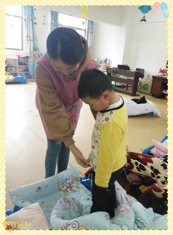 14:15剛從睡夢中醒來的小寶貝正在接受老師的幫助,穿衣穿鞋整理著裝。