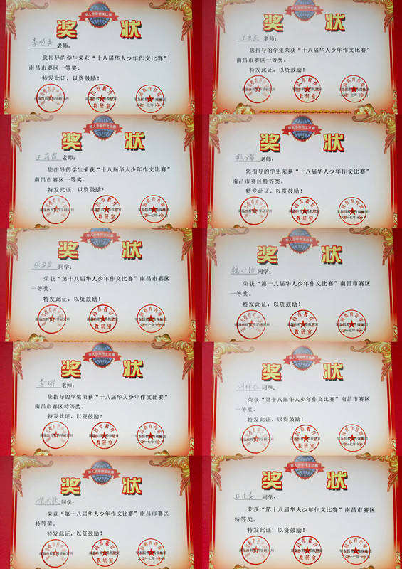 為建設(shè)書香校園,讓學(xué)生從閱讀和寫作中培養(yǎng)創(chuàng)造力和想象力,形成熱愛中華優(yōu)秀傳統(tǒng)文化的深厚感情,做祖國的好少年,致力于實現(xiàn)宏偉的中國夢。南昌現(xiàn)代外國語學(xué)校(象湖校區(qū))積極組織學(xué)生參與南昌市教育局教研室組織的第十八屆“騰訊智慧校園杯”華人少年作文比賽南昌賽區(qū)活動。2月2日傳來喜訊,該校五名學(xué)生喜獲佳獎,其中九(10)班胡佳美、六(1)班饒雨欣兩位同學(xué)榮獲南昌市賽區(qū)特等獎;六(4)班劉梓杰、九(1)張盈盈、八(1)班魏心怡三位同學(xué)榮獲南昌市賽區(qū)一等獎;李娜、熊梅老師指導(dǎo)學(xué)生榮獲南昌市賽區(qū)特等獎;李順秀、王康民、王莉霞老師指導(dǎo)的學(xué)生榮獲南昌市賽區(qū)一等獎。