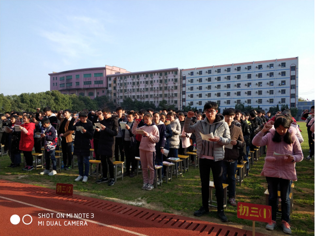 最后,在李明月同學(xué)的帶領(lǐng)下,全體師生宣誓——“苦磨九年,終成一劍;……我自信,我出色;我拼搏,我成功”。