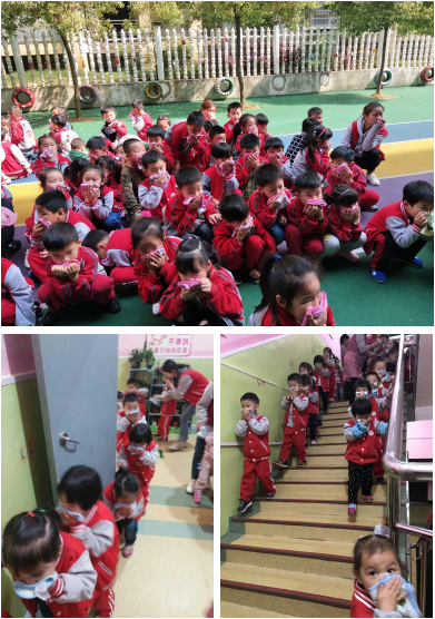 上午10點左右,樓下警報聲響起時,各班教師迅速帶領幼兒拿起教室的濕毛巾,捂住口鼻,彎腰小步快走,分兩道樓梯迅速且有序地下樓。途中,孩子們安靜且井然有序。很快孩子們集中到操場安全地帶圍城一堆,教師迅速地清點人數,并向主任報告人數。整個疏散活動只用了4分鐘。