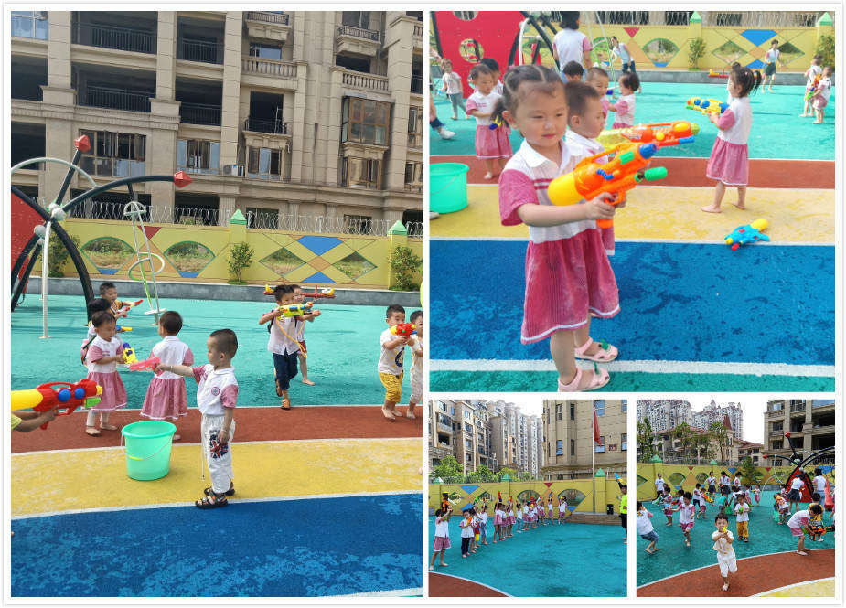 通過此次活動(dòng)的開展,讓孩子了解集體游戲中要遵守游戲規(guī)則;讓孩子學(xué)會(huì)與同伴合作進(jìn)行游戲,培養(yǎng)團(tuán)隊(duì)意識(shí);培養(yǎng)孩子躲閃、奔跑、手眼腿協(xié)調(diào)能力;讓孩子們感受到幼兒園活動(dòng)的豐富多彩、幼兒園是快樂的、幸福的。與水為樂,與快樂為伍,游戲點(diǎn)亮快樂童年,希望“水槍大戰(zhàn)”玩水游戲能夠成為孩子們美好童年記憶之一! 棉花糖哥哥帶來了特別涼爽的體能課——水槍大戰(zhàn)。