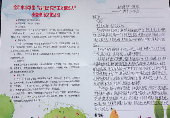 為深入貫徹團(tuán)市委、市教育局、市學(xué)聯(lián)、市少工委《關(guān)于在青少年中深入開展“我們是共產(chǎn)主義接班人”主題團(tuán)、隊宣傳教育活動的通知》的文件要求,進(jìn)一步引導(dǎo)廣大共青團(tuán)員、少先隊員樹立共產(chǎn)主義遠(yuǎn)大理想,堅定跟黨走中國特色社會主義道路的信念和信心,增強青少年對黨和社會主義祖國的樸素感情,近日,南昌現(xiàn)代外國語學(xué)校(象湖校區(qū))積極組織全校學(xué)生開展了以“我們是共產(chǎn)主義接班人”為主題的書信文化活動。此次活動旨在通過專用郵資信封和信箋作為載體,以傳統(tǒng)書信傳遞真情的形式,深化團(tuán)員和少先隊員對實現(xiàn)遠(yuǎn)大理想要靠廣大青年腳踏實地奮斗的認(rèn)識理解,讓青少年認(rèn)識到共產(chǎn)主義理想的實現(xiàn)需要一代又一代人的接力奮斗,鼓勵學(xué)生們不僅僅要做一名好學(xué)生,更要成為一個有所擔(dān)當(dāng)?shù)墓伯a(chǎn)主義接班人。